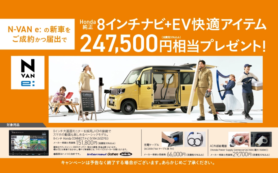 今ならN-VAN e:の新車をご成約かつ届出で247,500円相当のHonda純正8インチナビと
