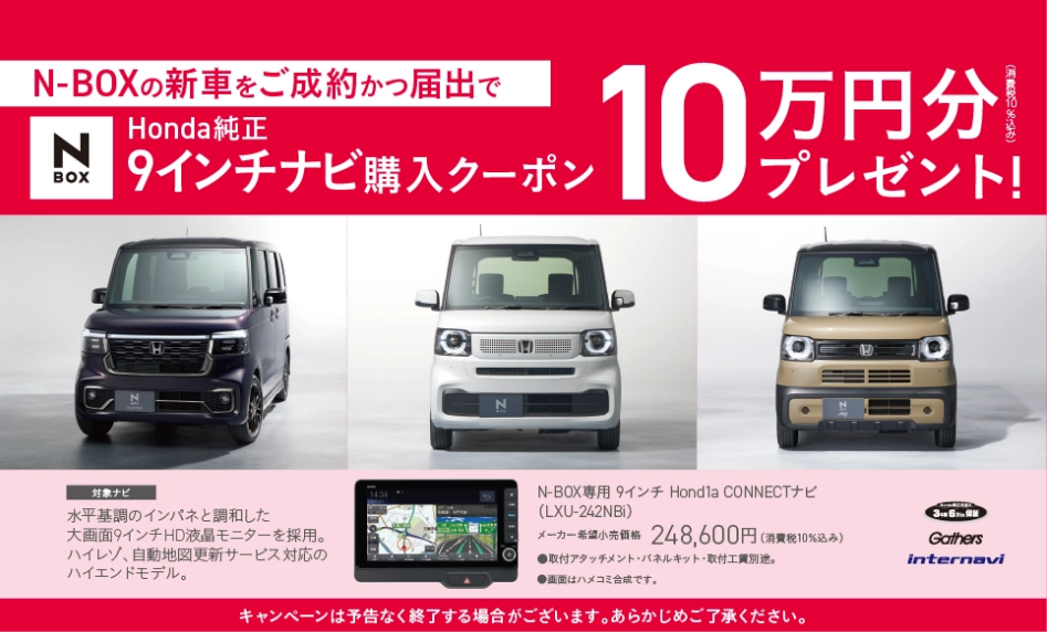 新車をご成約かつ届出でHonda純正9インチナビご購入クーポン10万円分プレゼント!!