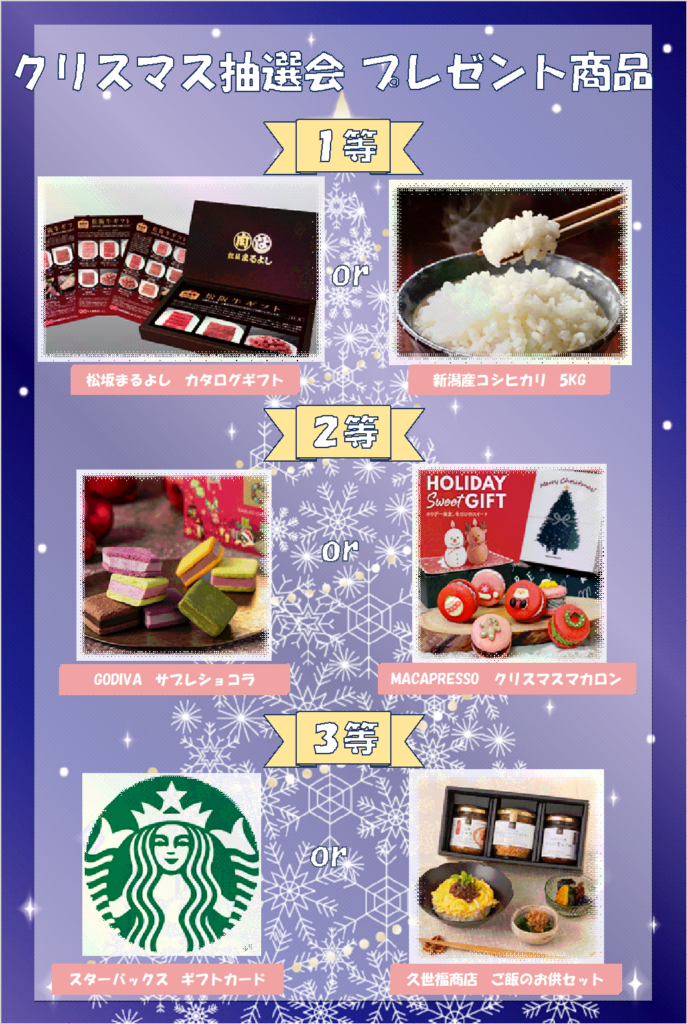 12月1日(月)~12月14日(日)の期間でクリスマス抽選会を行っております(^^♪