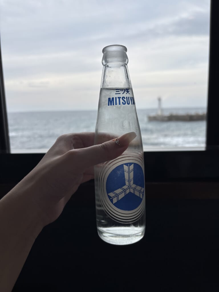 サイダーを頼んだらなんと瓶!お値段200円!良心的!窓のむこうは日本海!
