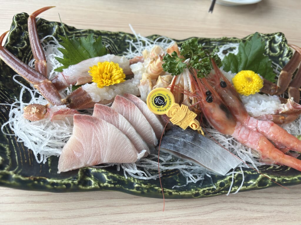 一品目はお刺身です!カニやブリ、甘エビのなどの新鮮なお刺身が最高です!🐟️