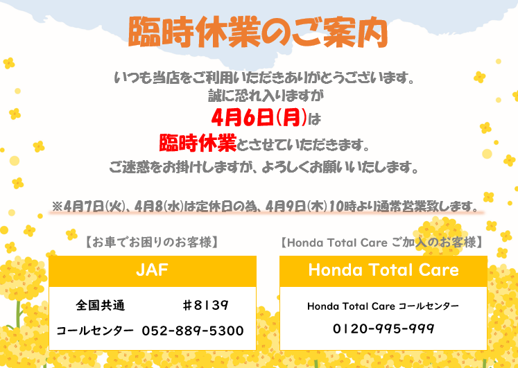 休業中にお車でお困りの際はHondaTotalCareまたはJAFをご利用ください。
